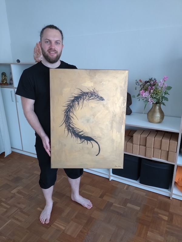 Einigen von Euch sind sicherlich die neuen Bilder im Eingangsbereich bzw. im Flur aufgefallen. Sie sind von Patrik Ziolkowski, einem jungen Künstler aus Braunschweig, der Kunst mit Achtsamkeit verbindet, um Räume für persönliche Entwicklung zu schaffen. Wir fühlten uns sofort angesprochen und sehen darin die Verbindung zu Yoga.